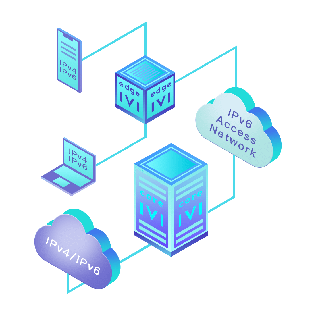 對正在進行IPv6整體升級規(guī)劃的運營商,應用IPv6升級方案2.5,通過IVI無狀態(tài)翻譯技術(shù)和純IPv6接入網(wǎng)絡(luò),為雙??蛻舳撕碗p棧服務(wù)器提供連通服務(wù)。
